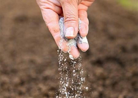 - In the right places, make holes with a scoop up to 5 cm deep. Into the holes, add a handful of ash and a teaspoon of carbamide, mix well.