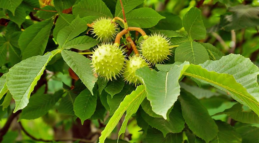 Chestnut is a tall tree that can decorate a summer cottage. The umbrella crown gives a thick shade, and delicate flower candles delight every spring for 2 weeks. In autumn, fruit pods covered with green thorns appear. When ripe, they crack, and from there hard glossy brown nuts fall to the ground.