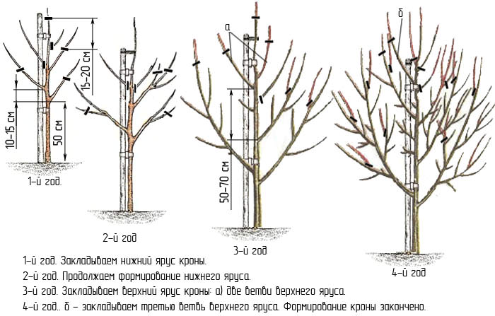 - In subsequent years, it is necessary to lay the upper tier of the branches. Shoots on the supporting lateral branches are removed, leaving 3 buds on each. All new processes emanating from the central trunk, except for the supporting 4–5 branches, are removed. The formation of the crown in this way is of the fan type.
