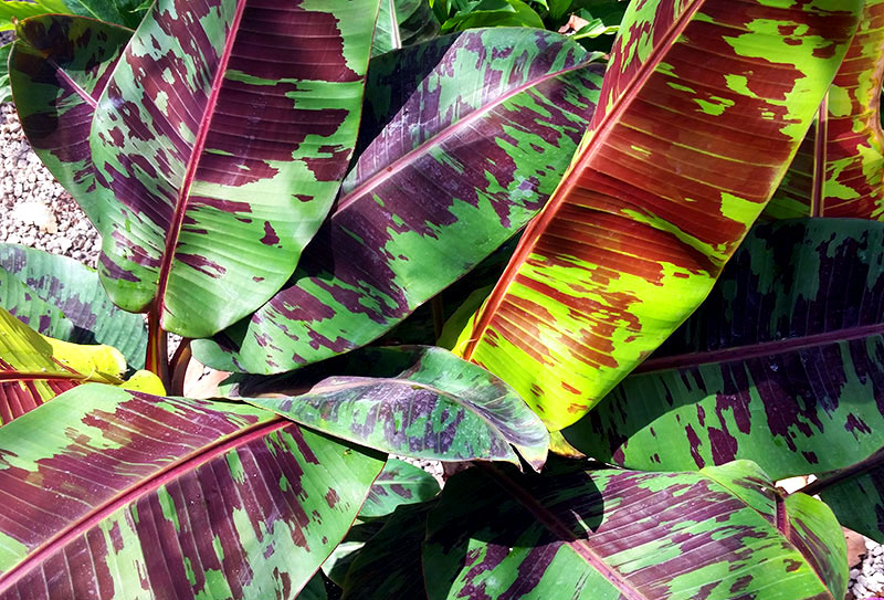 - Bloody banana (Musa Zebrina) is a variety in which the outside of the leaf plates are bright green with red spots, and the inside is completely scarlet. The fruits are tasteless and outwardly unlike ordinary bananas.
