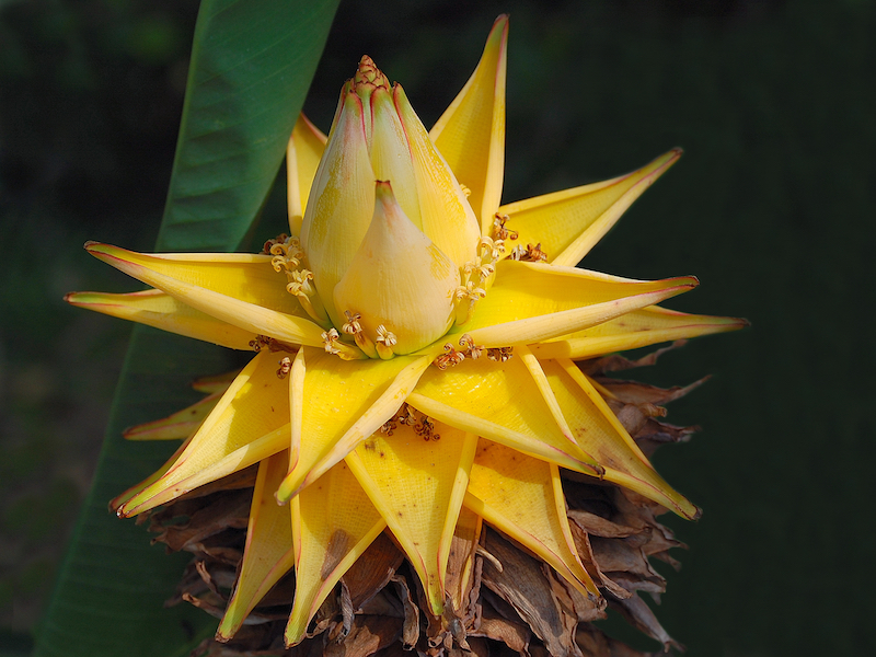 - The yellow banana (Musella Lasiocarpa) is a short and slow growing specimen. Blossoms with spectacular yellow flowers. Its flowering period lasts about six months.