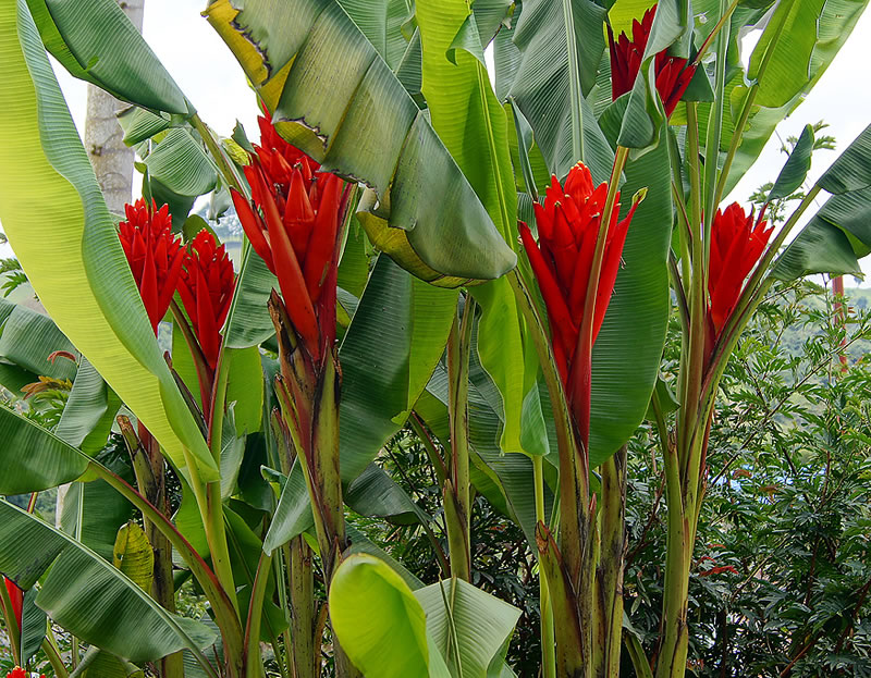 - Scarlet Banana (Musa Coccinea) is an ornamental perennial with narrow long green leaves and bloody inflorescences. Blooms for about 2 months.