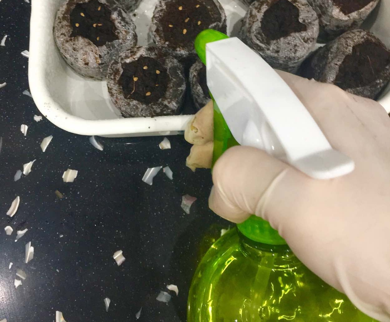 - The earth is moistened with a spray bottle.