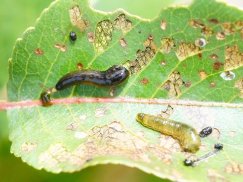 - The larvae of the cherry slimy sawfly eat away the pulp of the leaves, leaving only the veins of them