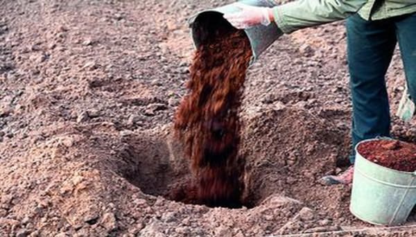 - Mix the rotted manure (2 buckets) with a fertile layer of earth, add 100 g of potassium sulfate and 400 g of superphosphate to the substrate and pour the nutrient mixture into the pit.