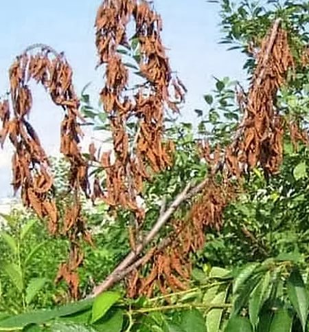 - Another scourge of stone fruits is coccomycosis, the causative agent of which can withstand the lowest temperatures, and during a humid warm summer, it affects plantings of sweet cherries, cherries, cherry plums and other stone fruits. At the same time, the leaves turn yellow ahead of time, become covered with dark spots and fall off. At the first signs of coccomycosis, trees are sprayed with a solution of soda ash at the rate of 50 g per bucket of water, adding 50 g of laundry soap. All treatments are carried out after harvest.