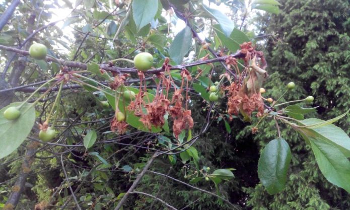 | Moniliosis | Infection occurs during flowering, after 10 days, whole branches with leaves and flowers dry up. It looks like the cherry has been scorched by fire. The disease is also called monilial burn. | |