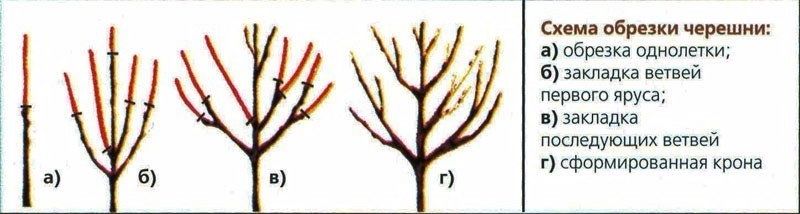 It is recommended to form the sweet cherry in the form of three- or four-stemmed bushes. To avoid gum lesions, cherries are pruned only in dry, warm weather at the beginning of summer. A stem is formed at least 60 cm. The branches are cut by a third or half, while the lateral branches are cut to the outer bud, shortening them by about one length. The main shoot, the guide, is left 20-30 cm longer. In the future, only annual shortening of the branches is required, which will restrain the growth of the cherry and stimulate the harvest.All pruning is done only at the beginning of summer: later manipulations can lead to drying out of the tree, disease and, ultimately, to its death.