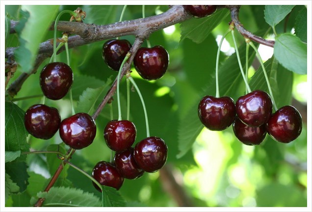 The fruits are very presentable - one-dimensional, large (8 g and more). Deep burgundy berries. The stone is small, it separates well from the pulp. The skin is thin, smooth. The berry flavor is rated 4.8 out of five. Average yield is about 30 kg per tree.