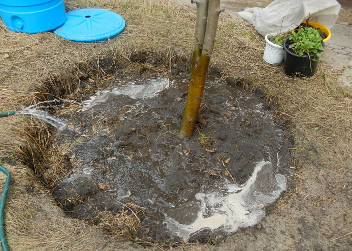 - Form the rim of the watering circle from the ground. Pour 2 buckets of water into it.