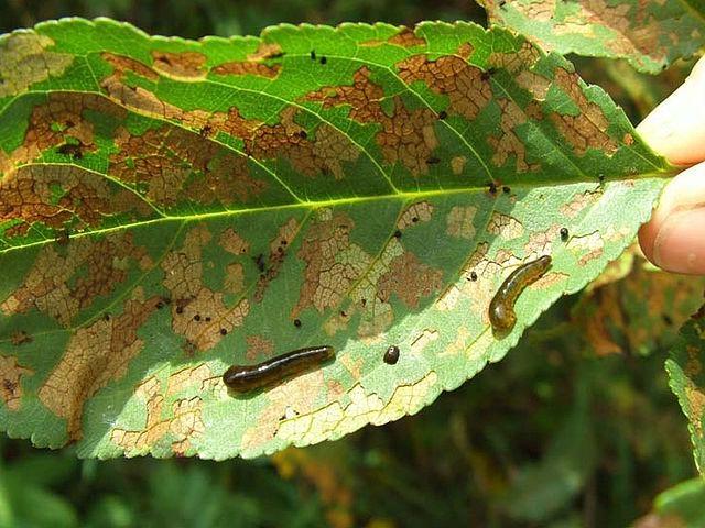 - The larvae of the slime sawfly feed on the pulp of the foliage, leaving only the veins