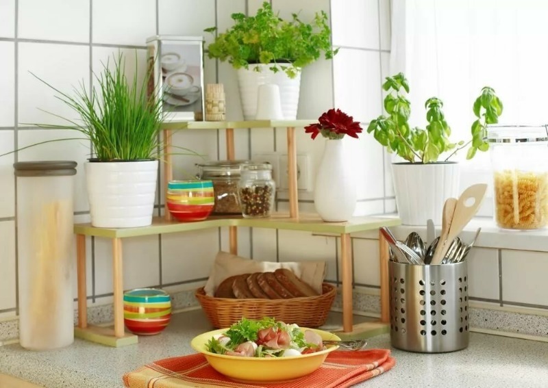 These plants will withstand the temperature and humidity changes that occur in the kitchen, and will add live colors to the interior. Place large plants on the floor, so they visually increase the height of the room. Small bushes - on shelves, in hanging pots and on window sills.