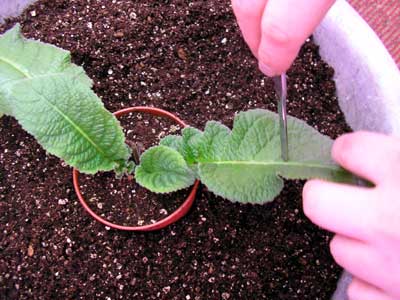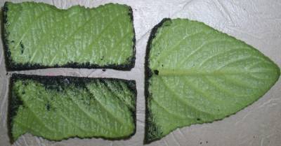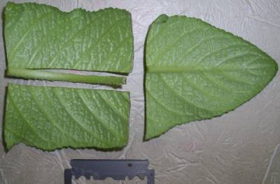 - Using a sharp instrument, cut the leaf blade into fragments 3-5 cm wide. The lines of the cuts should run perpendicular to the central vein, which is recommended to be excised.
