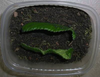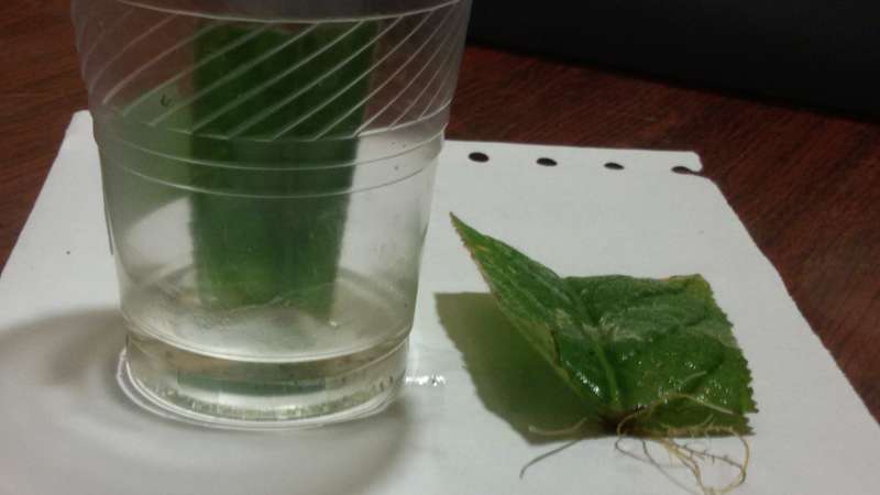 A little water is poured into a container, a fragment of a leaf is placed in it and a good root system is formed.