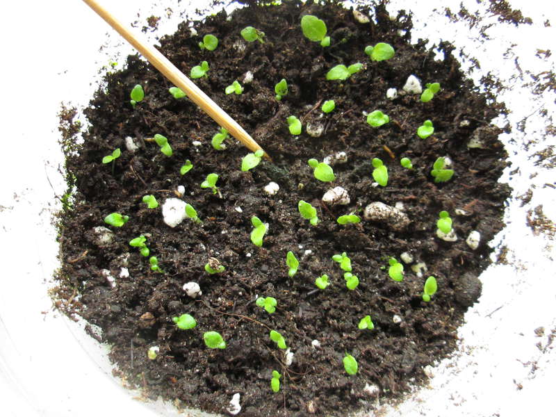 The first pick is recommended to be carried out about a month after the emergence of shoots. The sprouts are still very small, so they can be transferred to a new place of residence using tweezers or an ordinary toothpick. If the seedlings are not thickened, then the pick can be carried out in the same box in which they emerged.