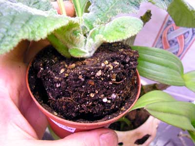 - Gently remove the streptocarpus from the old pot. Before this, the plant is not watered, so that it is better and easier to remove the old soil.