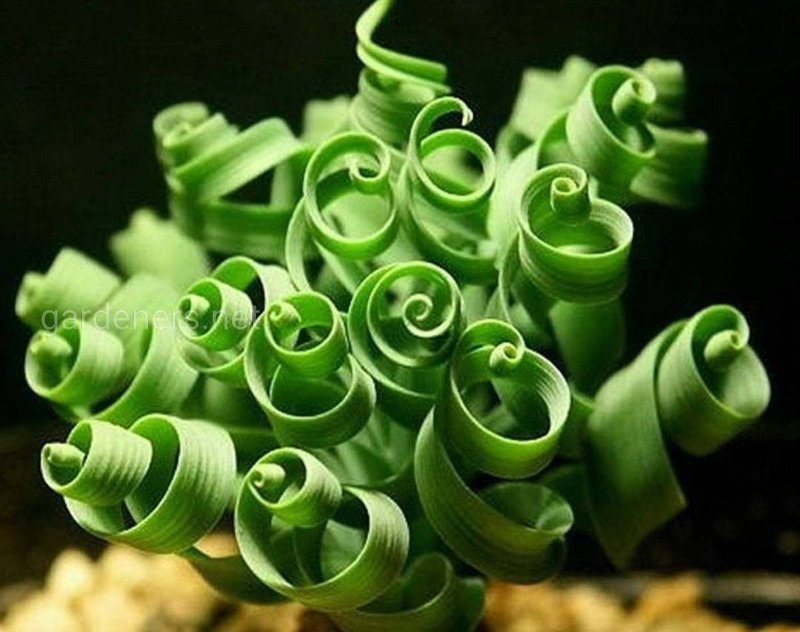 Elastic stems up to 50 cm in height are completely devoid of leaves, but during the flowering period they are covered with small flowers. The main condition for healthy growth of corkscrew grass is regular watering and moisturizing with a spray bottle.