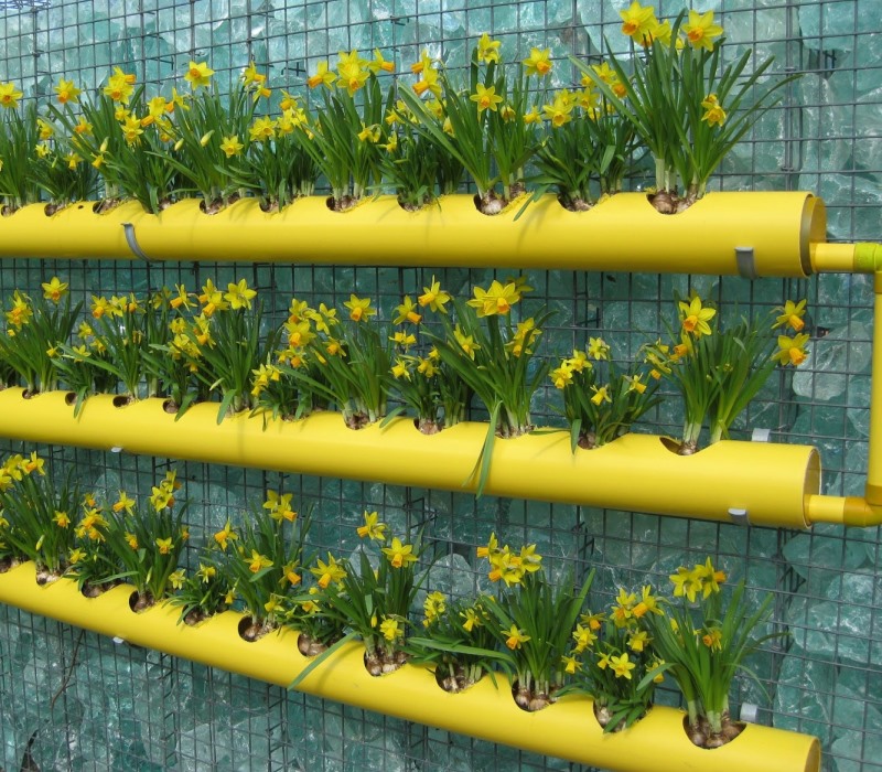 Round holes are made in them in random order, soil is poured inside and seeds or seedlings are placed. By rotating the pipes regularly, you will be able to control the amount of light in this mini-garden.