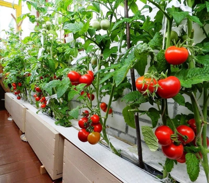 Take some tall wooden boxes and place them along the wall so that the maximum amount of light falls on the plants. Tomatoes, cucumbers and peppers can be grown in such a greenhouse.