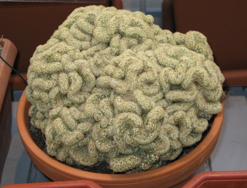 Brain cactus is an extremely unusual subspecies of mammillaria. It has a sinuous structure, so it looks like a green human brain, studded with many needles. The appearance of this plant seems unsightly to many people, so not everyone will like it. This type of cactus is quite rare.