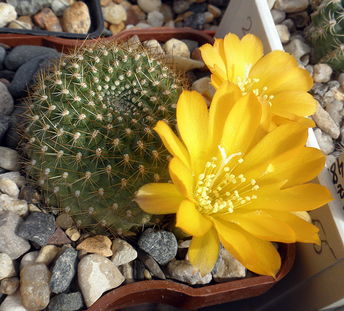 The rebutia of the marsoner has a spherical stem 4 cm in diameter and height, radially covered with small spines. The flowers are blood-red or yellow, up to 4 cm in diameter.