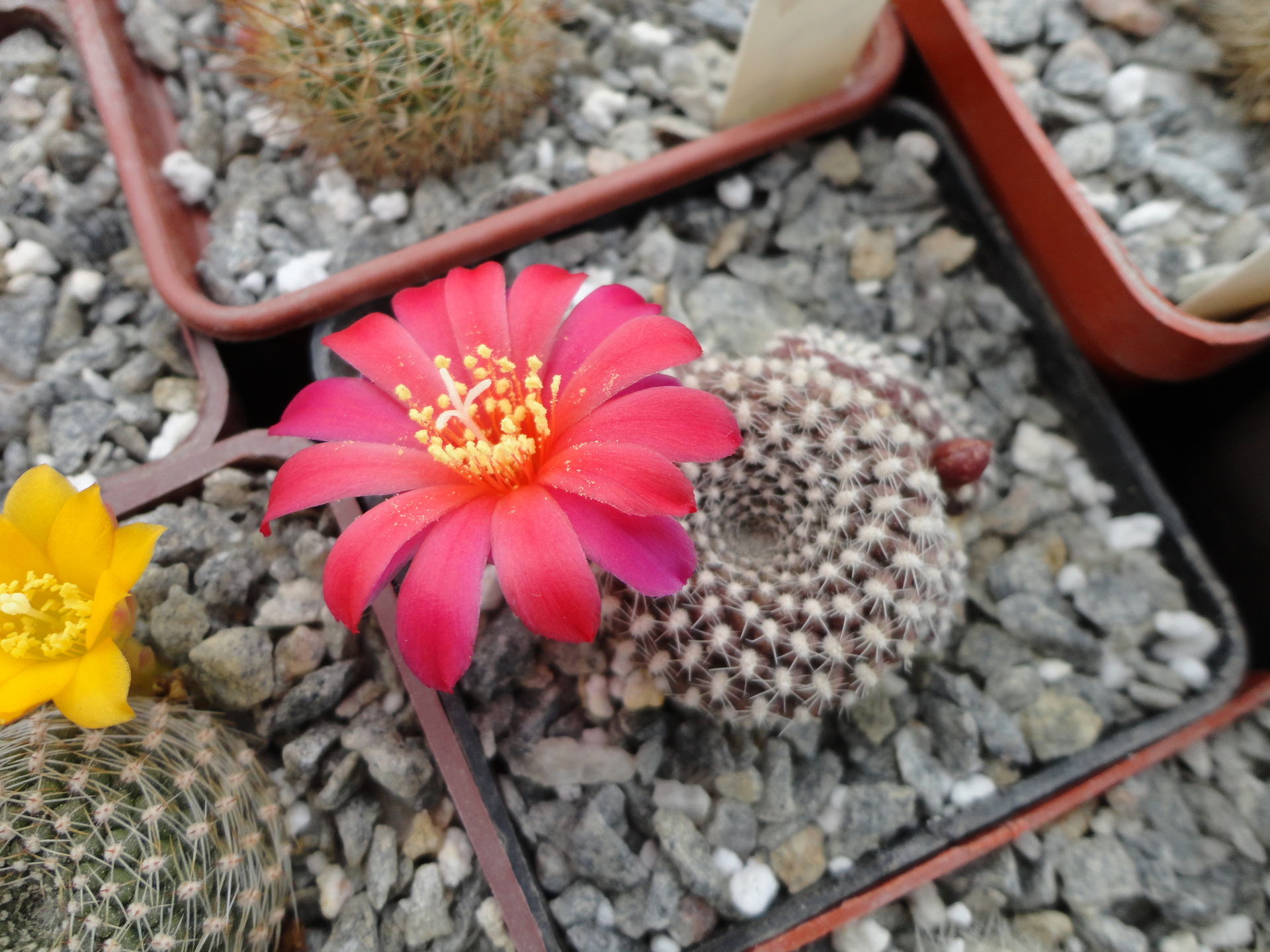 Senile rebutia has a stem up to 7 cm in diameter with many silvery radial spines.The flowers are deep red with a whitish pharynx.