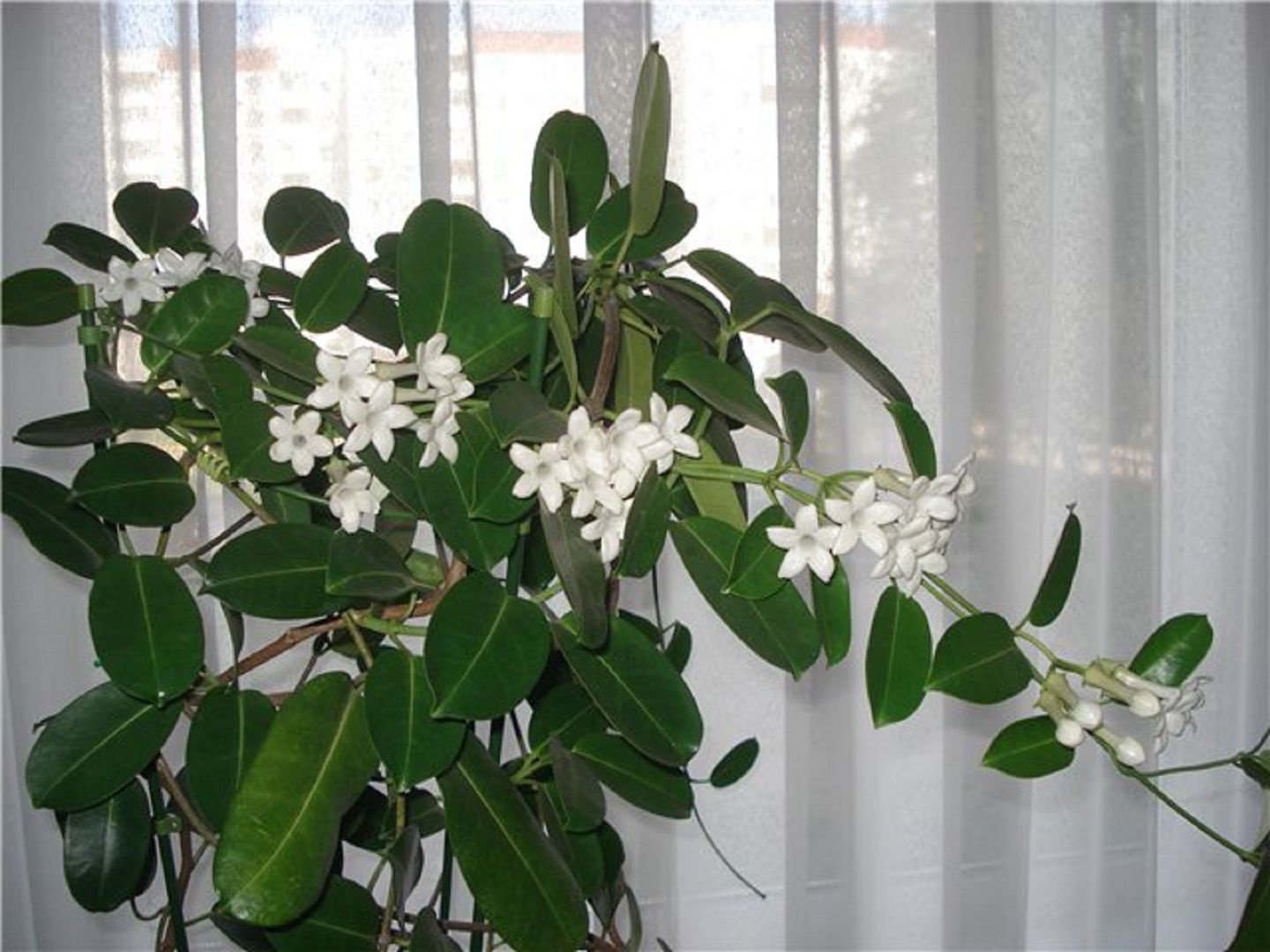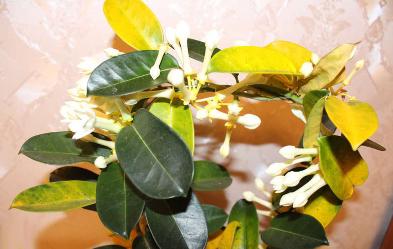 Stephanotis is an epiphytic plant that naturally grows on large trees or shrubs, clinging to their trunks with its tenacious shoots. The stems can be up to six meters in length, so a special support is an important accessory in growing this flower.