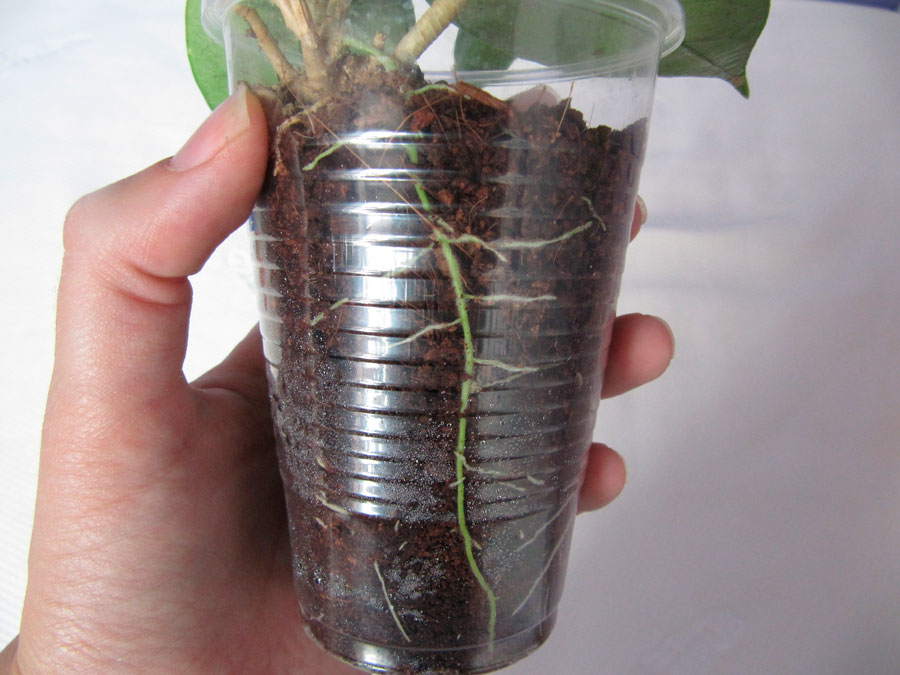 The roots will appear within a month. You can transplant young plants after the appearance of young shoots on them. They are seated in several pieces in a pot and transferred to a place protected from direct sunlight with an air temperature of 16-18 ° C. After the vine grows more than a meter in length, it is cut by 1/3 to enhance branching.