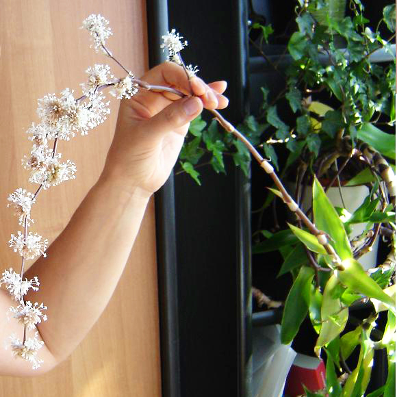 During flowering, the golden mustache throws out a long peduncle with small white and very fragrant flowers. Reproduces by rooting small outlets.