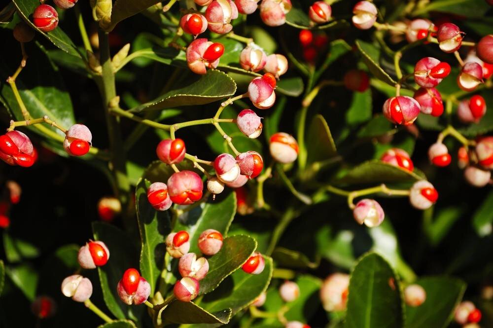 The fruits of the plant are boxes with seeds of the brightest colors: scarlet, burgundy, crimson, pink. Like other parts of the shrub, the fruits of the spindle tree are poisonous.