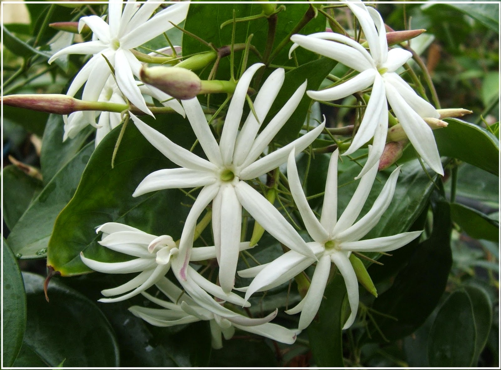 Jasmine is the finest or multi-flowered - the plant is an evergreen shrub or pubescent liana native to the northern region of Kalimantan. On thin shoots, lanceolate-oval simple leaves grow, which in length reach 3.5 cm... At the base, the leaves are heart-shaped, and at the top they are pointed. It blooms from January to March with large, white, fragrant flowers.