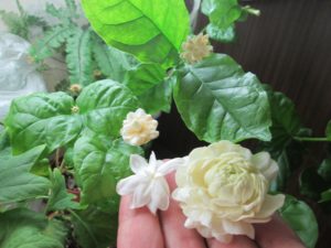 Jasmine Sambac (photo) is the national flower of Indonesia, native to Tropical Asia. Growing up to 4-6 m liana has thin, pubescent shoots and opposite, ovoid leaves. Blunt or pointed at the apex; at the base, they are often rounded. White simple, semi-double or double flowers are collected in an umbrella-like manner. Blooms profusely from March to October. Fragrant jasmine sambac flowers can be added to tea, giving it a unique taste. Most often used as a houseplant.