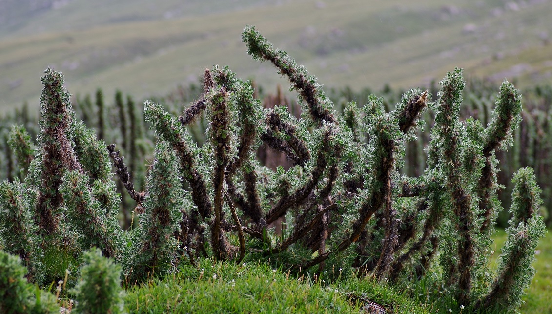 An unusual subspecies with thorny shoots and very small leaves, the ends of which are decorated with small thorns. It blooms in large buds up to 2 cm in diameter, the shrub grows to a height of 1–1.5 m.