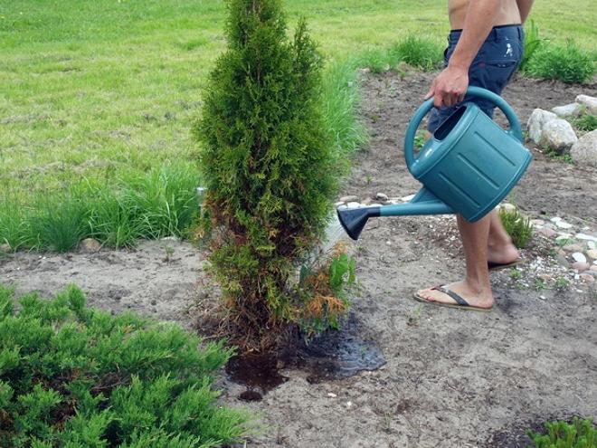 Thuja is a moisture-loving culture. During the first month after planting in the ground, it is watered at least once a week, spending 15–20 liters of water per plant. If it is hot outside and there is no precipitation, the intervals are reduced to 2-4 days.She does not tolerate drought - the shoots are numb, the needles lose their tone, they may even turn yellow.