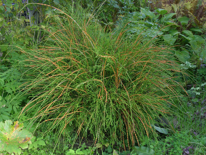- Filiformis. Shrub, the height of which does not exceed 1.5 m. The crown is almost round, the shoots are thin, dull. The needles are bright green, brown in winter.
