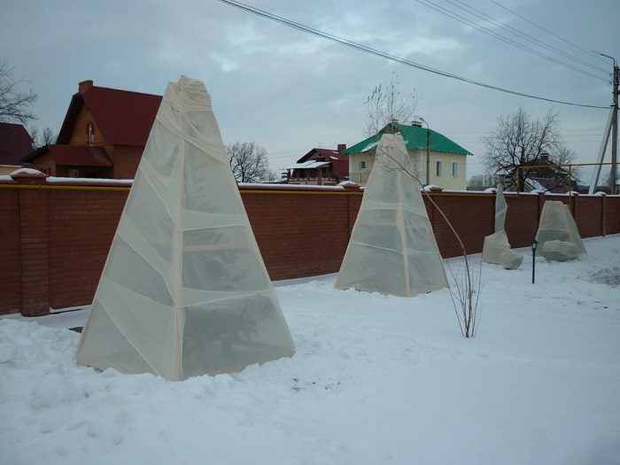 Above the larger specimens, they build something like a hut. Several layers of burlap or any breathable covering material are pulled onto the supports installed by the "house". Plastic wrap and any synthetics are categorically not suitable. Then the resulting structure is tied with twine. They take it off in the spring, when the temperature is positive.