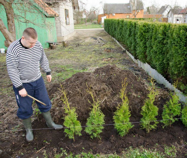 Directly planting a thuja in the ground is not difficult. It is similar to the same procedure for any fruit trees and berry bushes. Even an inexperienced gardener can handle it.