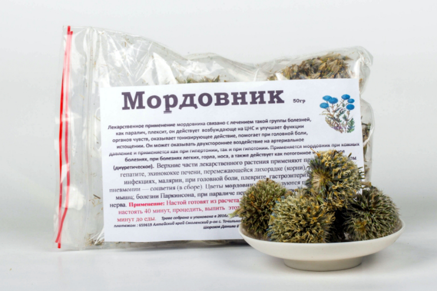 In folk medicine, the ball-headed or round-headed mordovna is also used, which is distinguished by large blue inflorescences. From its above-ground and underground parts, drugs are prepared that have a diaphoretic and diuretic effect.