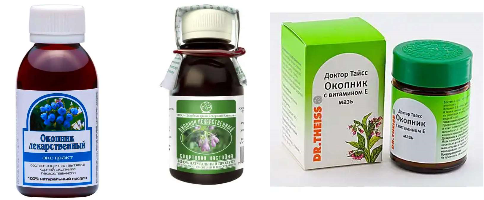 In pharmacies, you can purchase various forms based on comfrey: dry herbal raw materials, alcohol tincture, elixir, ointments (pure and with the inclusion of other useful components).