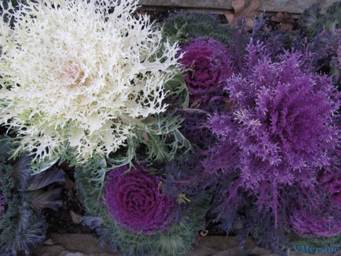 Ornamental rosette cabbage is also used for vertical gardening of the site. The compositions usually combine cabbage of different colors.