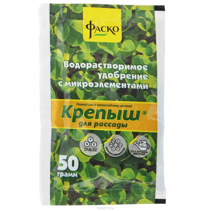 - Krepysh - a water-soluble fertilizer, most of which is nitrogen, promotes the growth of seedlings and increases immunity