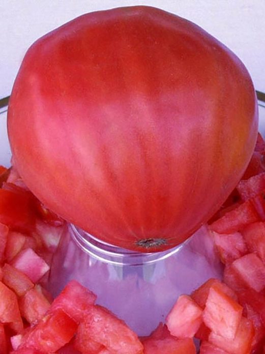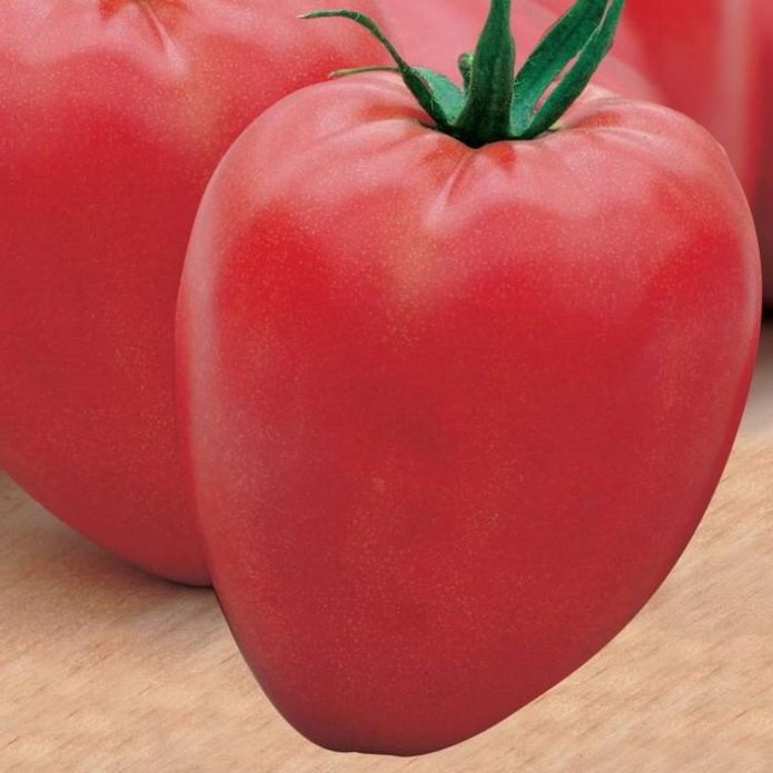 The peculiarity of the variety is a heart-shaped red fruit with a raspberry shade. The pulp is pinkish, sweet, with a barely noticeable sourness. Unripe Bovine Heart tomatoes have pronounced dark green "shoulders" (as the people call the area around the stalk). The meaty fruit gains weight from 110 to 225 g or more.