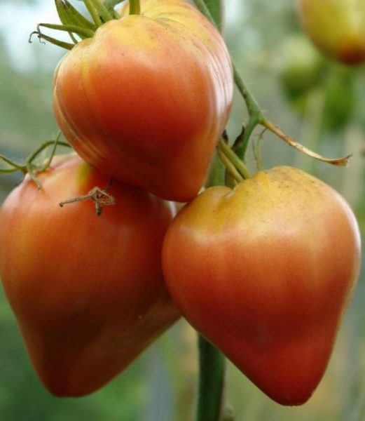 Bovine heart is a late-ripening variety, grown both in greenhouses and in the open field. From germination to maturation, 120-130 days pass. The plant is indeterminate. The leaves are drooping, green, medium in size. The bush is spreading, in greenhouse conditions it reaches a height of 1.7 m. Forms simple inflorescences, the first flower cluster is laid above the 8-9th leaf.