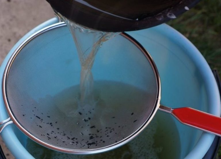 - Pour 1 liter of wood ash into a bucket of water, stir.