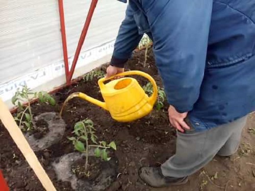 In order for the bush not to fatten, but to tie the fruit, the ground in the root area at a depth of up to 30 cm should dry out from time to time. After this happens, the tomato is watered abundantly, allocating 3 liters for a young bush and 5 liters for an adult. Avoid getting moisture on the leaves so as not to provoke burns and fungal diseases. The moisture content of the soil is checked with a finger or a hygrometer - a device for measuring soil moisture.