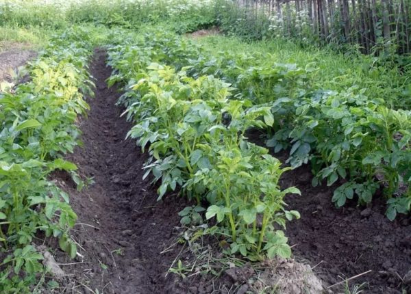 The accumulation of moisture at the root system can be detrimental to the potato bush. Therefore, watering the crop should be infrequent and strictly correspond to the growing seasons. During the first watering, the plant receives moisture in order to fully form the tops and flowers; the second ensures the laying of tubers after the plant has faded; the third feeds the roots as they grow.