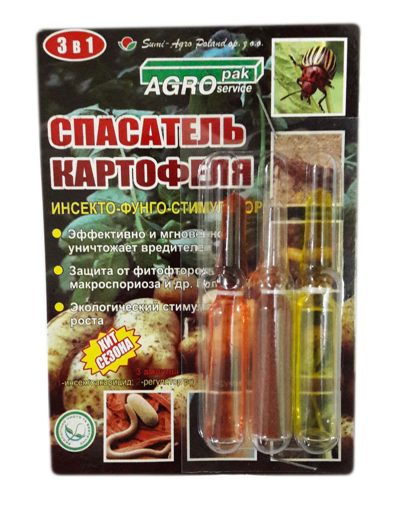 In case of simultaneous damage to the beds by diseases and insects, you should not process the potatoes with a mixture of various poisons. It would be more correct to use a complex insecto-fungo stimulant, for example, the Potato Rescuer. It is a set of three ampoules, which respectively contain:
