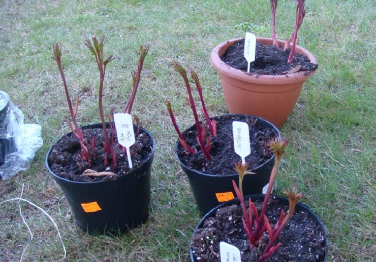 The seedlings of ITO and tree-like varieties of peonies are placed in the pit so that the buds of renewal remain on the surface, the grafting is 10–12 cm underground. Simultaneously with the plant, a stake is placed in the hole for subsequent tying of long shoots.