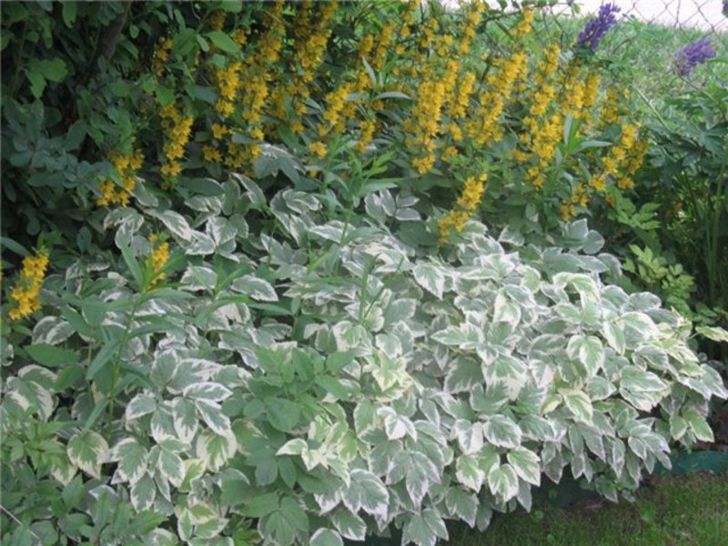 Runny variegated is a perennial herb of the Umbrella family. It has a long life span of up to 50 years.Creeping is considered to be a weed plant because it covers the soil with a dense carpet and slows down the evaporation of moisture. The foliage of the plant has an unusual pistachio color with white edging along the edges of the leaf plate. Dream inflorescences are formed by small white flowers. Flowering lasts about a month and occurs if the plant grows in sunny areas.