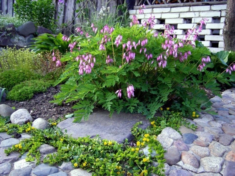 The garden dicentra is a perennial herb, some varieties of which may be bush-shaped. In the wild, the dicenter grows in Asia and North America. The dicentra has a straight stem, the height of which reaches 1.5 meters and a well-developed fleshy root system, which is sensitive to high moisture content in the soil. The leaves grow on long petioles, smooth, with a slight sheen.